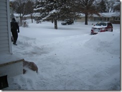 This morning, at 4:45, Louie drove around the block to see if he could get us out and down to work. He had no problems. Work was cancelled for us, but at 7 am, when Louie tried to go to work himself, it was a whole different story. He had a hard time getting out of the end of the driveway, then he was stuck in the street at the end of the driveway. Once he got himself out there, he got stuck several more times before he finally got to the main road. He drove out Main Street and out the highway, but when he got to where he was to turn into work, the entrance was blocked, the lot was fully drifted, and snow was up against the building halfway up the service bay doors. He called me, then came home, but not before he called everyone and told them to stay put. He worked about 3 hours on the driveway to get it cleared. He was just about done with the rough clean when the city plow came past, and left a wall of snow ‘Louie chest high’. He came in for a break for about an hour then went back out to finish the job.